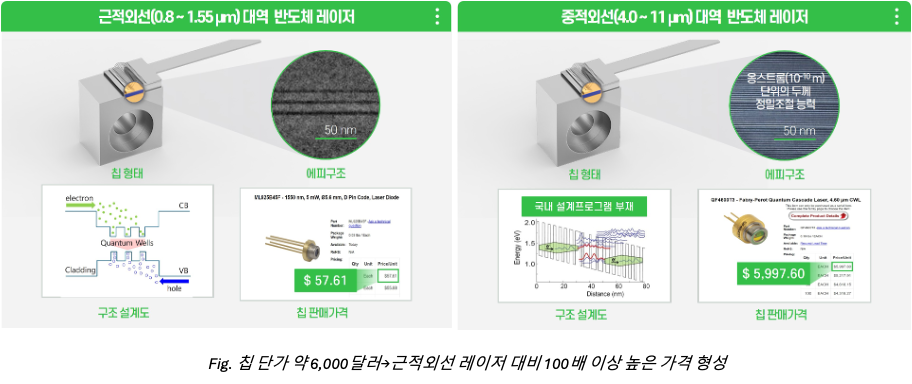 이번 연구의 목표는 7.7 μm 파장대역에서 1.5W 이상의 피크 출력, 그리고 상온 연속동작이 가능한 QCL 칩 패키지를 구현하는 것이다. 이를 통해 국내 최초 QCL 국산화 성과를 확보하고, 나아가 방산·의료·환경·산업 전반에 활용될 수 있는 고부가가치 광원을 공급하는 것을 목표로 한다. 단순히 국산화를 넘어 가격을 해외 제품의 절반 수준으로 낮추고, 소형화 및 방열 성능을 대폭 개선해 글로벌 경쟁력까지 확보한다는 전략이다.