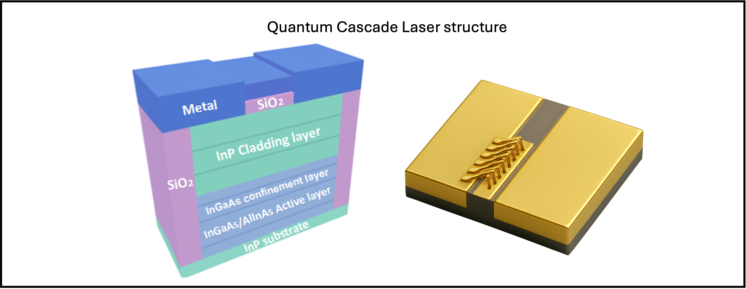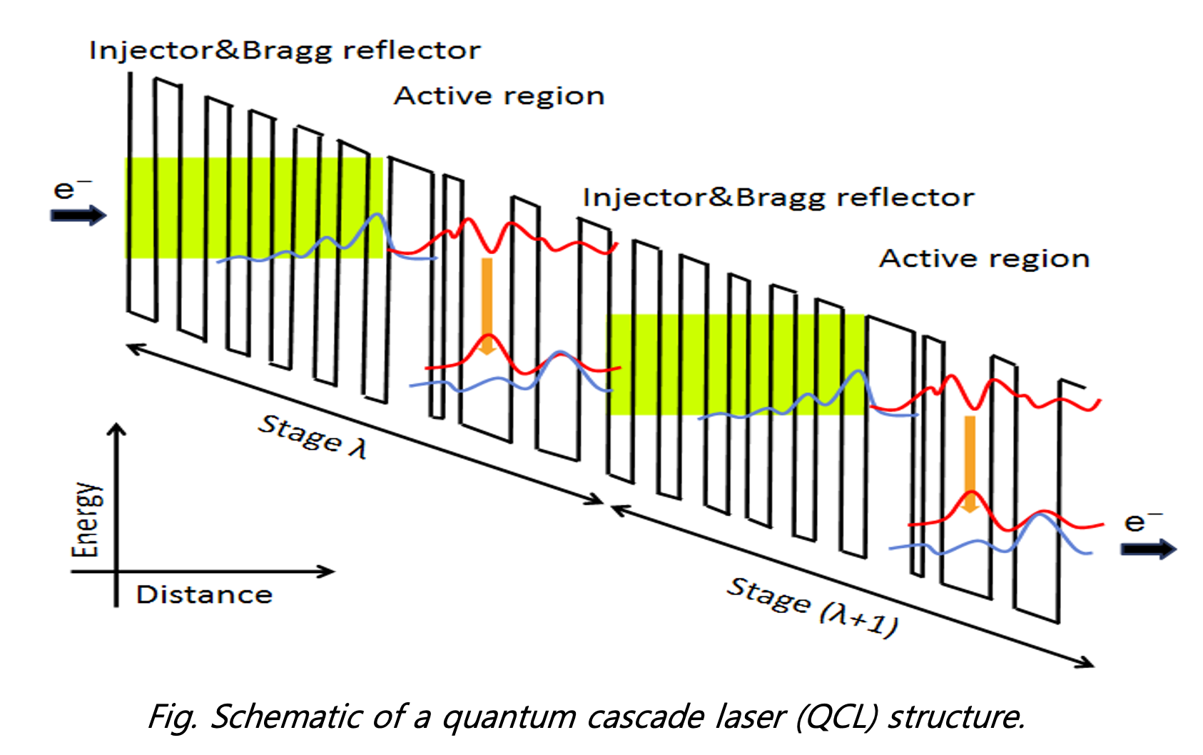 Unlike conventional semiconductor lasers that rely on electron–hole recombination, QCLs are unipolar devices that utilize intersubband transitions of electrons within multiple quantum well structures. Electrons cascade down through dozens of precisely engineered active regions, emitting a photon at each step. This cascading mechanism allows a single electron to generate multiple photons, resulting in high quantum efficiency and strong optical output power.